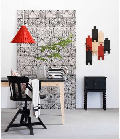 Abat-jour contreplaqué de bouleau vernis ou lacqué, Ø36, H46cm, 69 €/pièces, élément mural 2 portes en pin massif teinté, L22×P13, H63cm, 35€, table de chevet en pin massif teinté, L46×P28, H72cm, 99€, rideaux en lin et coton, 145×300cm, 39,95€ collection Ryssby – Ikea.