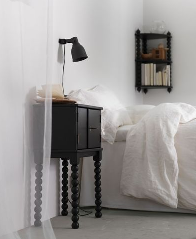 Etagère d’angle en pin massif teinté, L32×P32, H71cm, 59€, table de chevet en pin massif teinté, L46×P28, H72cm, 99€, collection Ryssby – Ikea.
