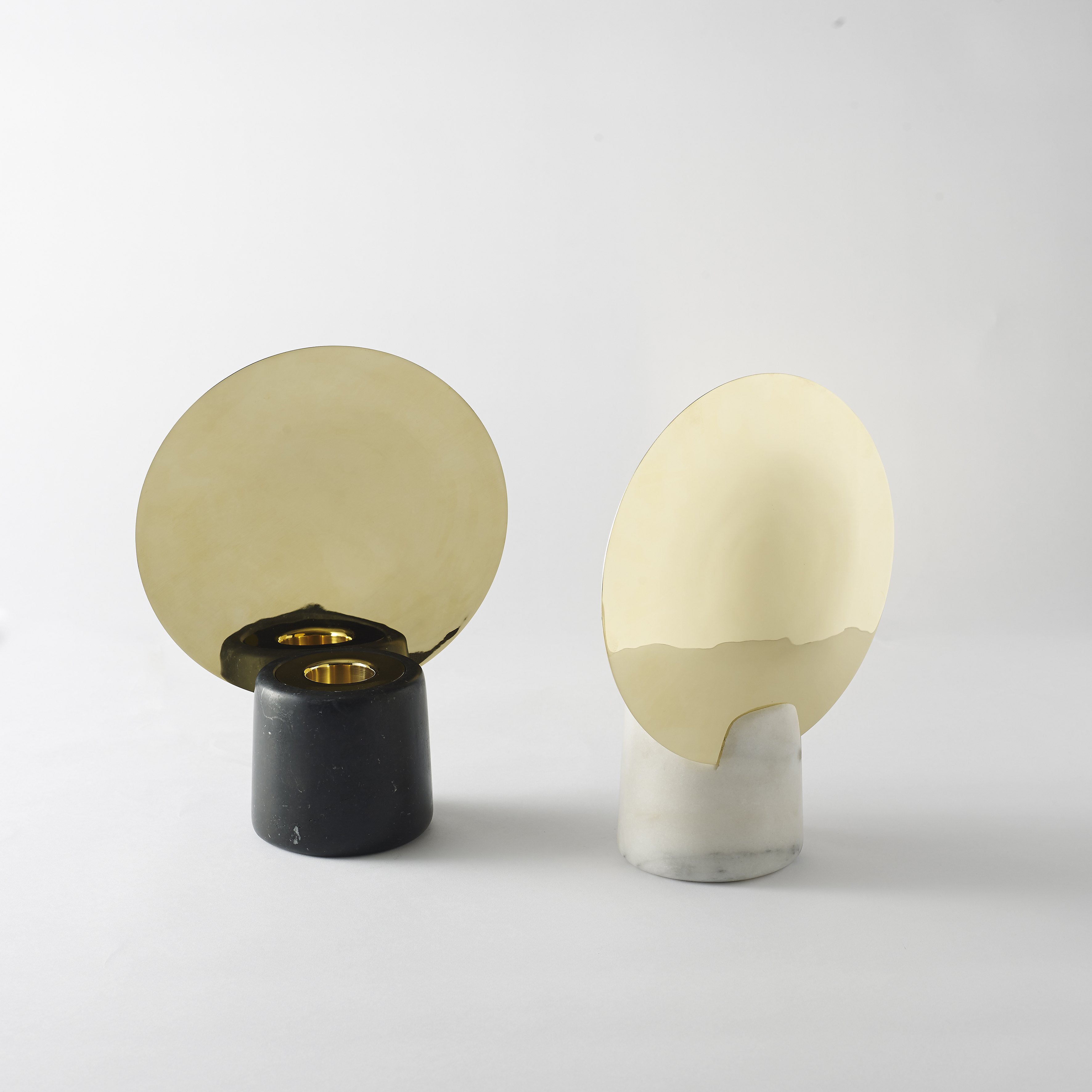 Photophores « Peacock » de Dan Yeffet avec base conique en pierre dans laquelle s’insert un disque en laiton poli. Version haute permettant d’accueillir une bougie flambeau.