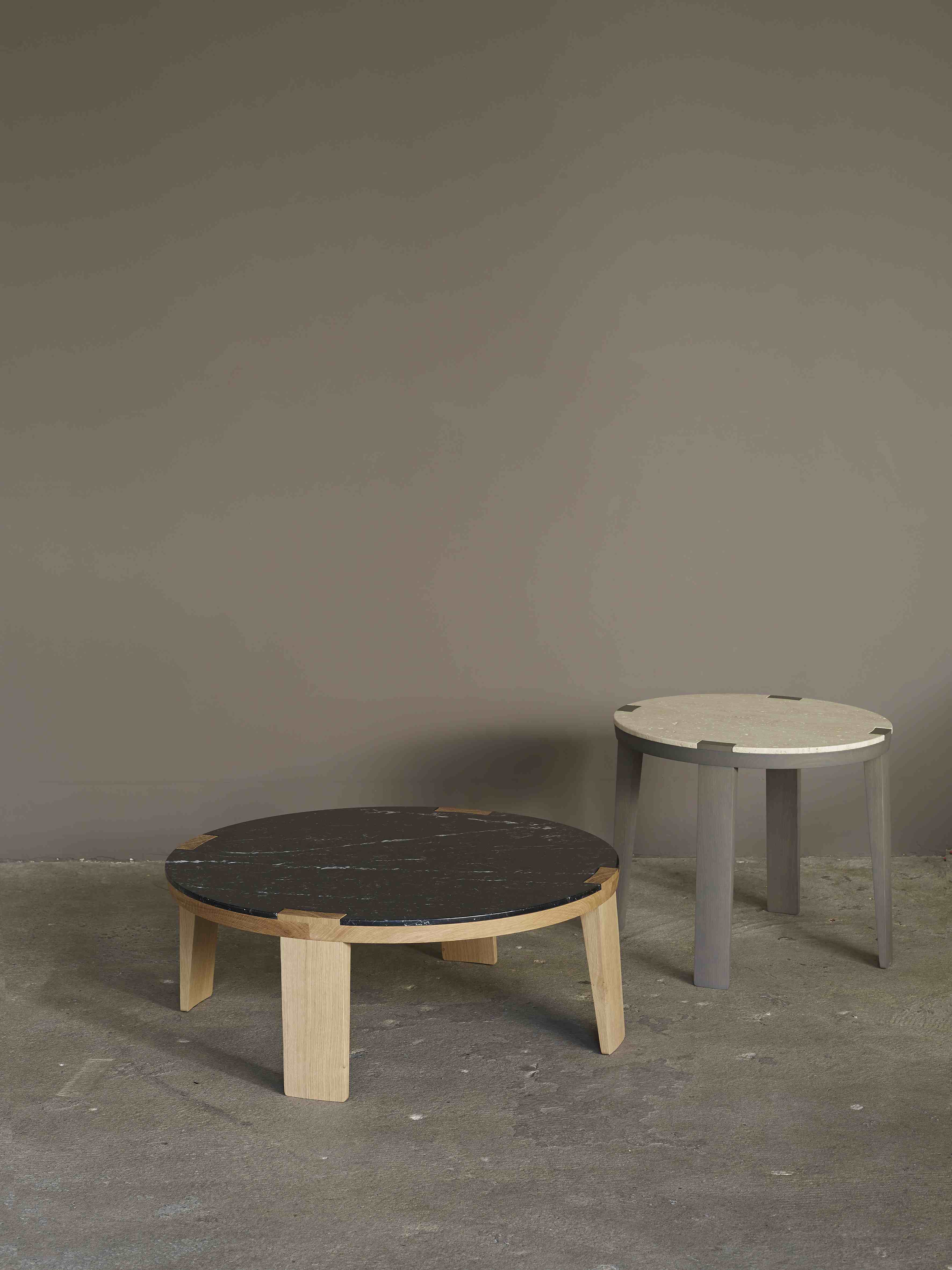 Tables de Dan Yeffet « Sumo » avec structure en chêne massif naturel ou teinté gris et d’un plateau en pierre (marbre noir ou travertin), D 55 x H. 45,8 cm ou D 80 x H. 30 cm