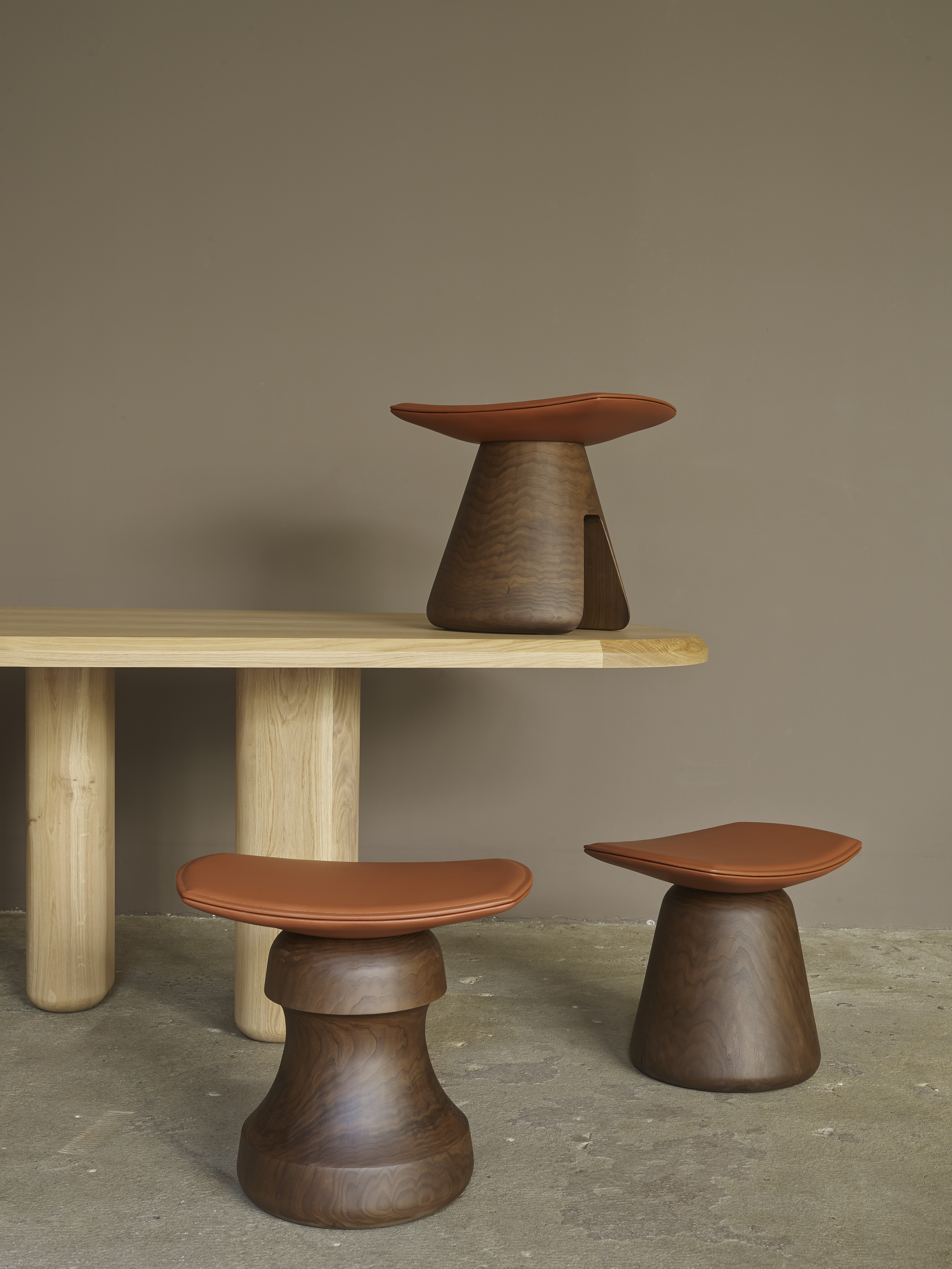 Tabourets « Roi, Fou, Mat » de Christophe Delcourt en noyer français massif finition vernie. Assise en bois et mousse gainée de cuir naturel, H. 38 et 42,5 cm