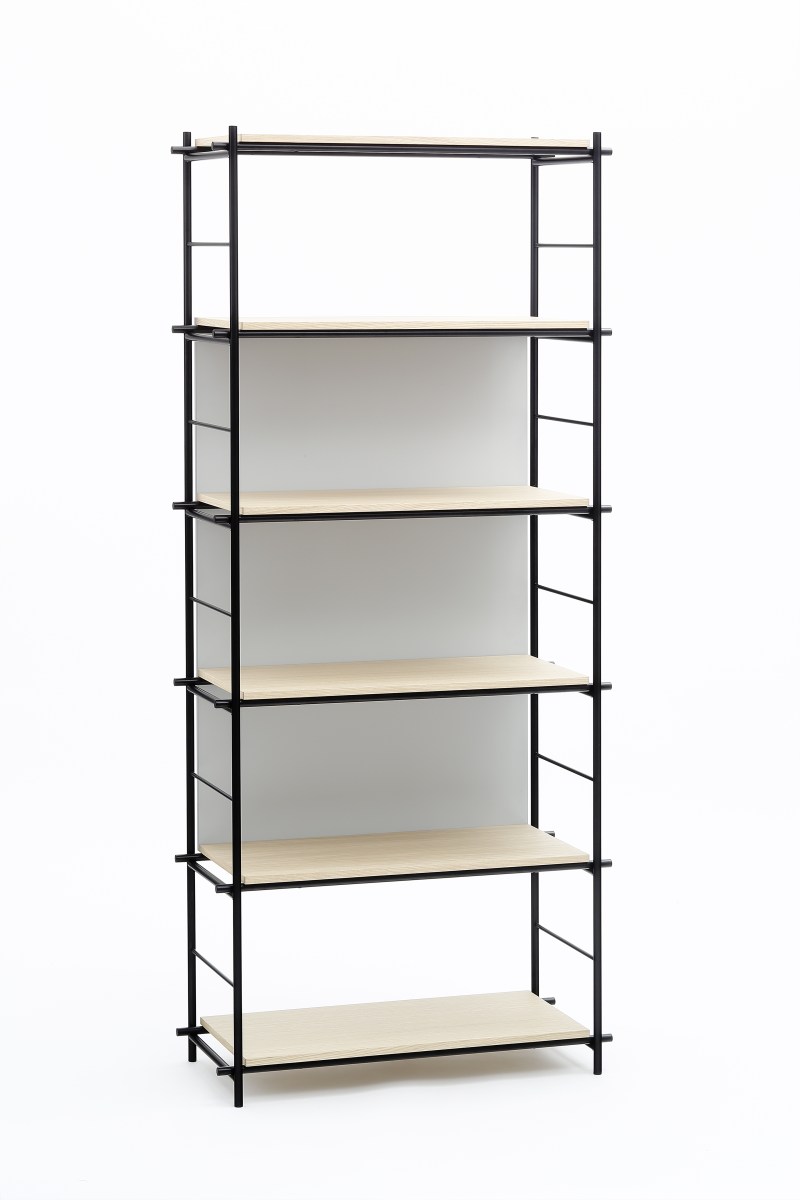 Bibliothèque « Solferino » de Marco Zanuso Jr en métal expoxy noir mat, 6étagères en placage de chêne naturel vernis mat. Dossier laqué gris sur MDF, L 80 x P 35 x L 183 cm, prix sur demande, Coedition