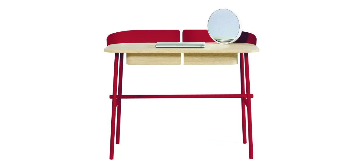 Bureau « Victor » de Pierre-François Dubois, en MDF recouvert d’un placage en chêne haute finition, piètement en métal, laque mate, L 100 x P 60 x H 84 cm, 650€, Harto