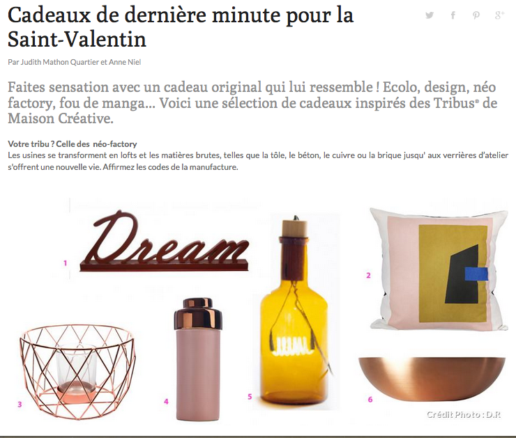 J-2 pour la Saint Valentin Publié par judithmathon 0 Voici ma sélection de cadeaux pour la Saint-Valentin à découvrir sur le site Maison Créative Partager :Tweet Cliquer pour imprimer(ouvre dans une nouvelle fenêtre) Imprimer Cliquer pour envoyer un lien par e-mail à un ami(ouvre dans une nouvelle fenêtre) E-mail J’aime chargement… Similaire