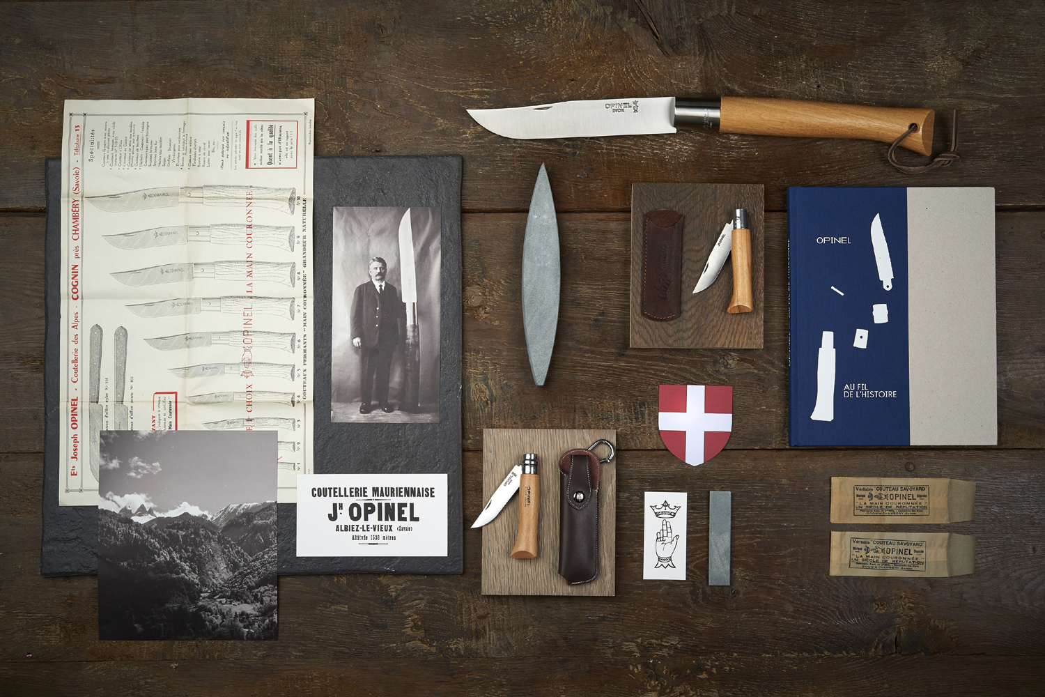 Tout a commencé en 1890 dans un village au coeur des Alpes ou Jospeh Opinel travaille dans l’atelier de son père, forgeron-taillandier à Albiez-le-Vieux. Il dessine et met au point un petit couteau de poche qu’il destine aux paysans et villageois de la région. En 1897 il réalise la série des douze tailles, les couteaux seront numérotés du N°1 au N°12. Dans le respect de la tradition coutelière il dépose en 1909 la marque « La Main Couronnée » qui sera désormais présente sur chaque lame.