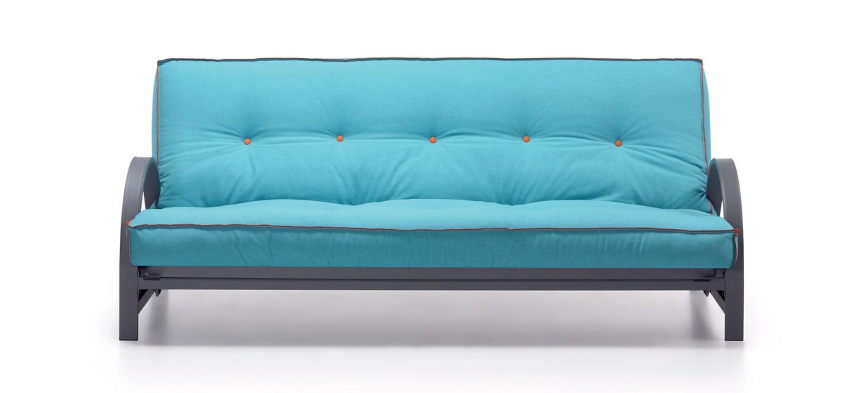 Canapé lit « Fusion » convertible, mécanisme clic-clac, avec sommier en lattes et futon de polyurethane et coton. Structure métallique. Mesure lit 130×195 cm. 364€, Kave Home