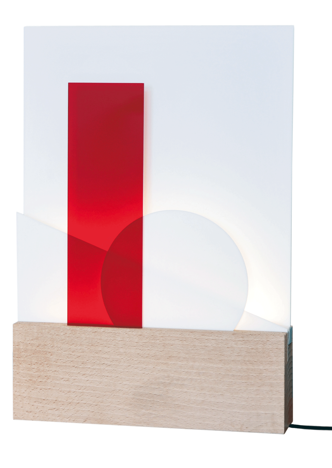 Lampe Euclide avec sept plaques différentes, socle en hêtre massif et plaques en PMMA acrylique. L’Atelier d’exercices
